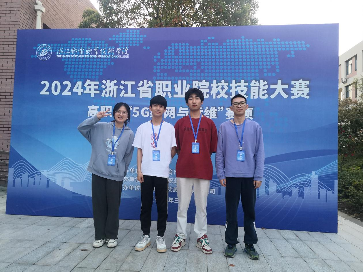 近日,2024年浙江省职业院校技能大赛“5G组网与运维”赛项在浙江邮电职业技术学院成功举办,来自全省19所高职院校的38支队伍同台竞技。经过一天的激烈角逐,由金华职业技术学院信息工程学院(怀卡托国际学院)张嵚、刘丽丽两位教师指导的邹超、陈槿轩两位同学组成的团队获比赛二等奖,王一多、毛扬之两位同学组成的团队获比赛三等奖。