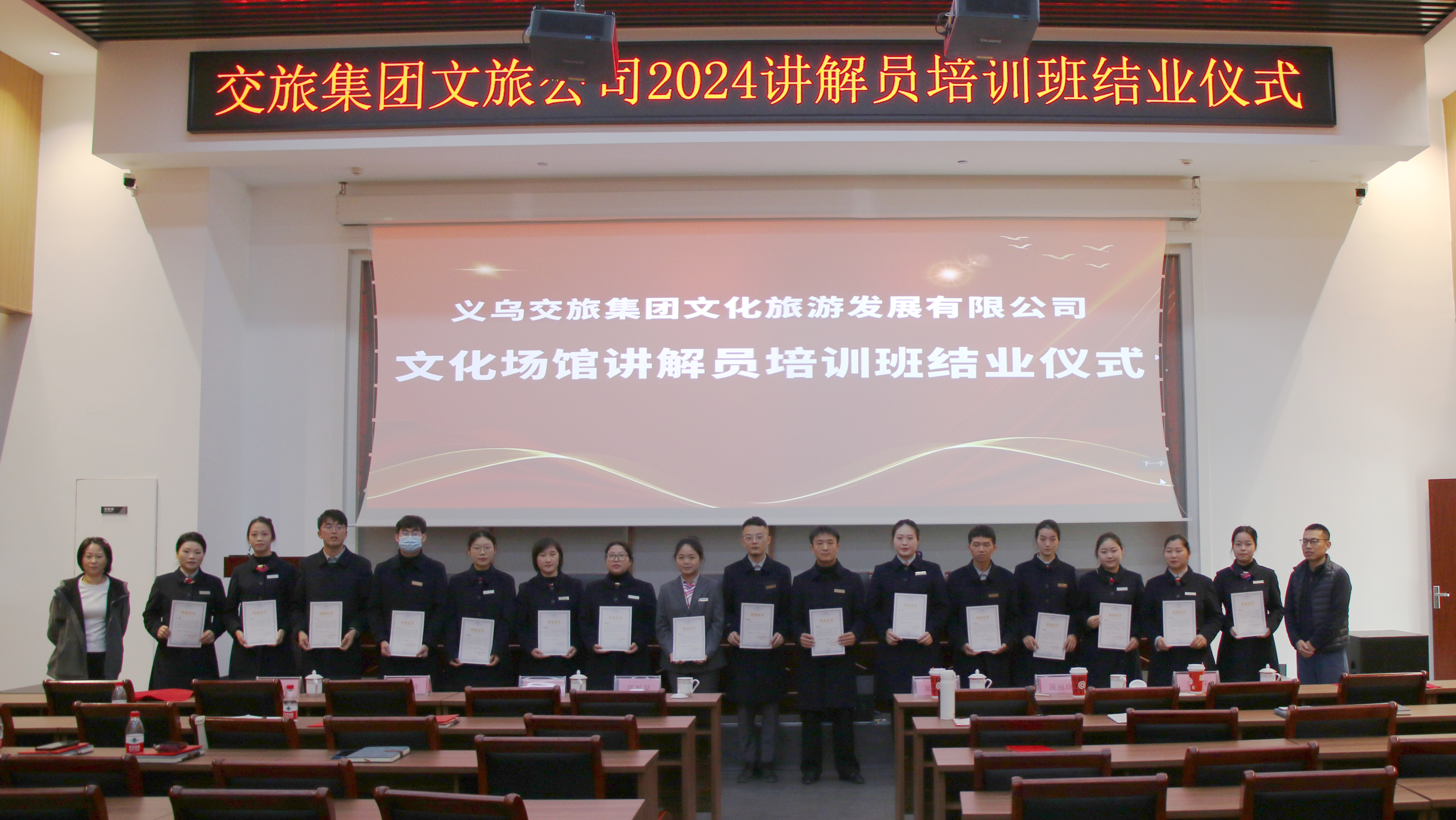 为进一步深化产教融合,推进校企、校校深度合作,近日,金华职业技术大学文旅学院携手义乌市国际商贸学校,与义乌交旅集团文旅公司合作,开展文化场馆讲解员培训。结业仪式在侵华日军细菌战史实(义乌)陈列馆举行。文旅公司代表和授课老师代表及全体学员出席结业仪式。来自侵华日军细菌战史实陈列馆、雪峰文学馆、吴晗史学馆及桥头考古遗址公园的17名讲解员全部顺利结业。