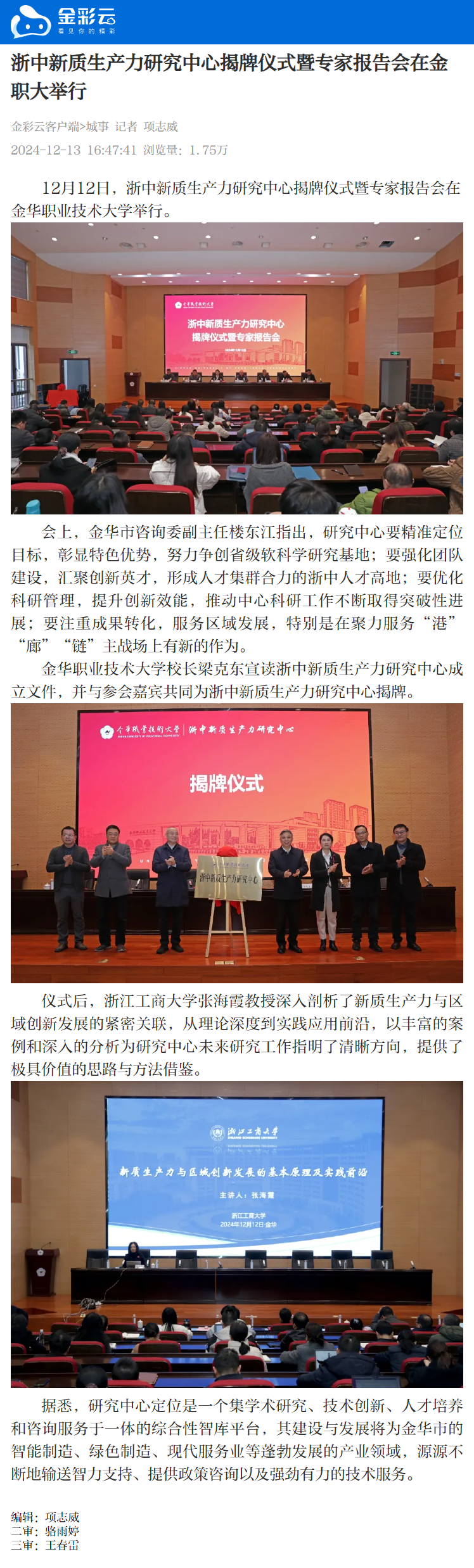 金彩云:浙中新质生产力研究中心揭牌仪式暨专家报告会在金职大举行