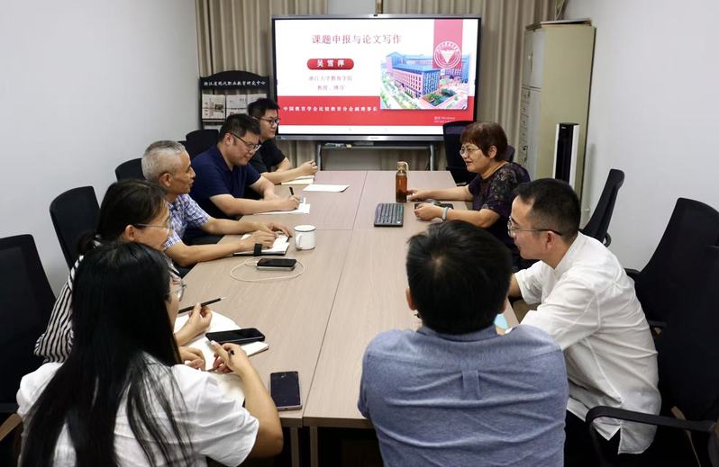 9月23日下午,浙江省现代职业教育研究中心在西教一606室举行了第27期“大黄山职教讲坛”活动。本次活动邀请了浙江大学教育学院博士生导师、中国教育学会比较教育分会副理事长吴雪萍教授来中心作主题为“课题申报与论文写作”的报告。职教中心全体研究人员聆听了主题报告。