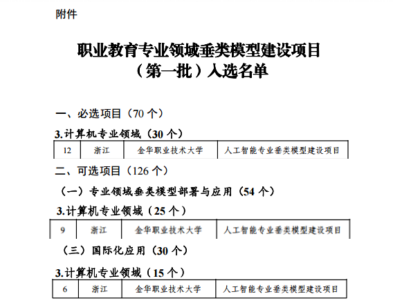 此次教育部职业教育专业领域垂类模型建设项目,是落实国家职业教育数字化战略、推动AI技术赋能职教生态的重要举措,共遴选70个必选项目与126个可选项目,覆盖通信、智能制造、计算机三大专业领域。金华职业技术大学在计算机专业领域表现突出,申报的“人工智能专业垂类模型建设项目”成功入选必选项目(计算机专业领域30个项目之一),同时该项目也被纳入可选项目中的“专业领域垂类模型部暑与应用”、“国际化应用”2个类别。