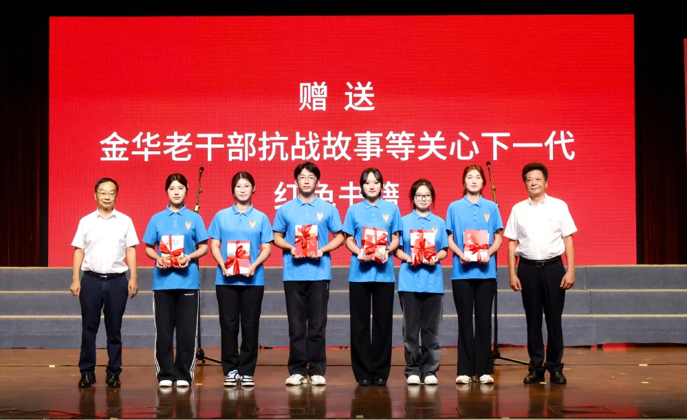 楼伟民与金中梁向青年学子赠送《金华离休干部抗战故事》等红色书籍,勉励同学们“读红色经典,做时代新人”。