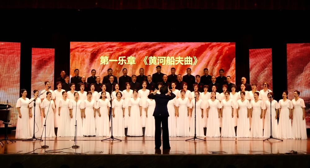 本次合唱展演组曲《黄河大合唱》,共分为八个乐章:《黄河船夫曲》呐喊出逆流而上的勇毅,《黄河颂》诉说了华夏儿女对母亲河的无限崇敬,《黄河之水天上来》则描绘了奔流不息的黄河风光,展现了黄河与中华民族命运血脉相连。随后,音调朴素的《黄水谣》和平缓悠长的《黄河怨》相继展开,再现了山河破碎的伤痛和对侵略者的控诉。《保卫黄河》《怒吼吧,黄河!》则气势磅礴、排山倒海,恰似黄河的波涛滚滚奔流势不可挡,将整场演出推向高潮。