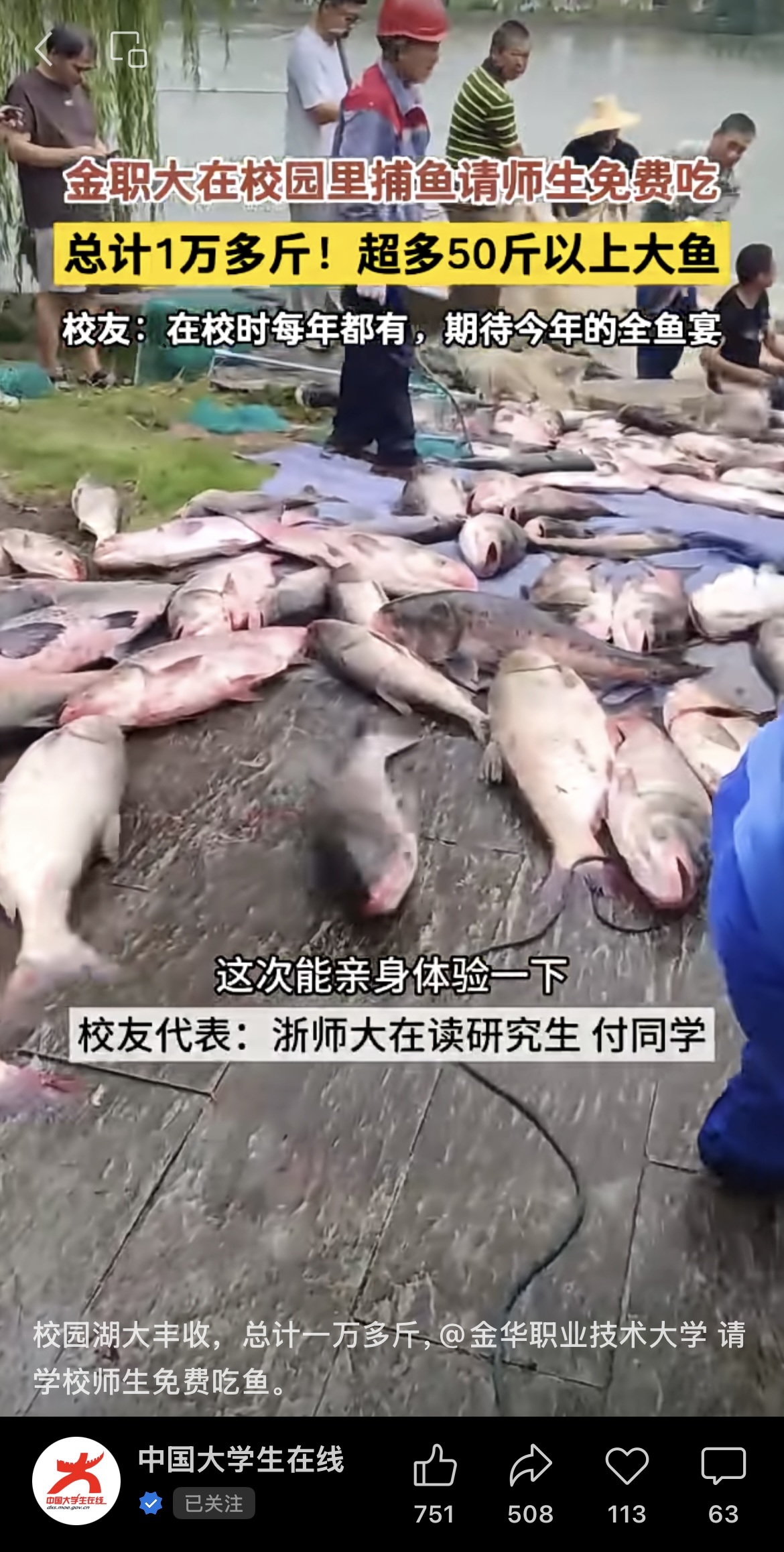 中国大学生在线视频号:校园湖大丰收,总计一万多斤,@金华职业技术大学 请学校师生免费吃鱼。