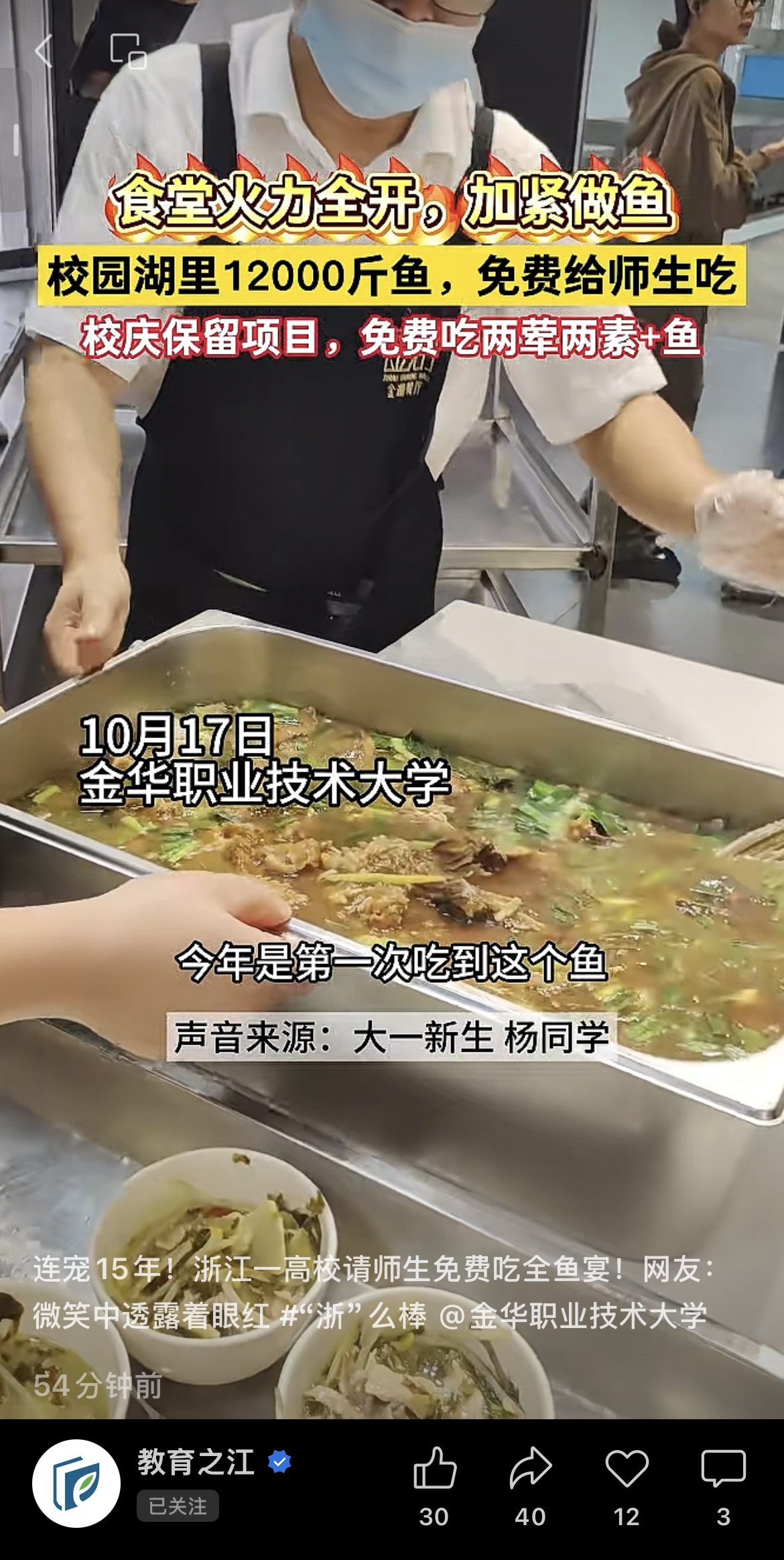 教育之江视频号:连宠15年!浙江一高校请师生免费吃全鱼宴!网友:微笑中透露着眼红 #“浙”么棒 @金华职业技术大学