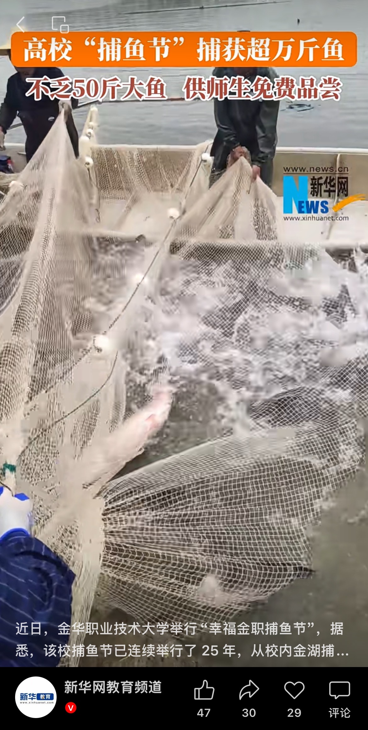新华网教育频道视频号:近日,金华职业技术大学举行“幸福金职捕鱼节”,据悉,该校捕鱼节已连续举行了 25 年,从校内金湖捕获的鱼,将在学校食堂烹制后免费向全体师生供应。@金华职业技术大学