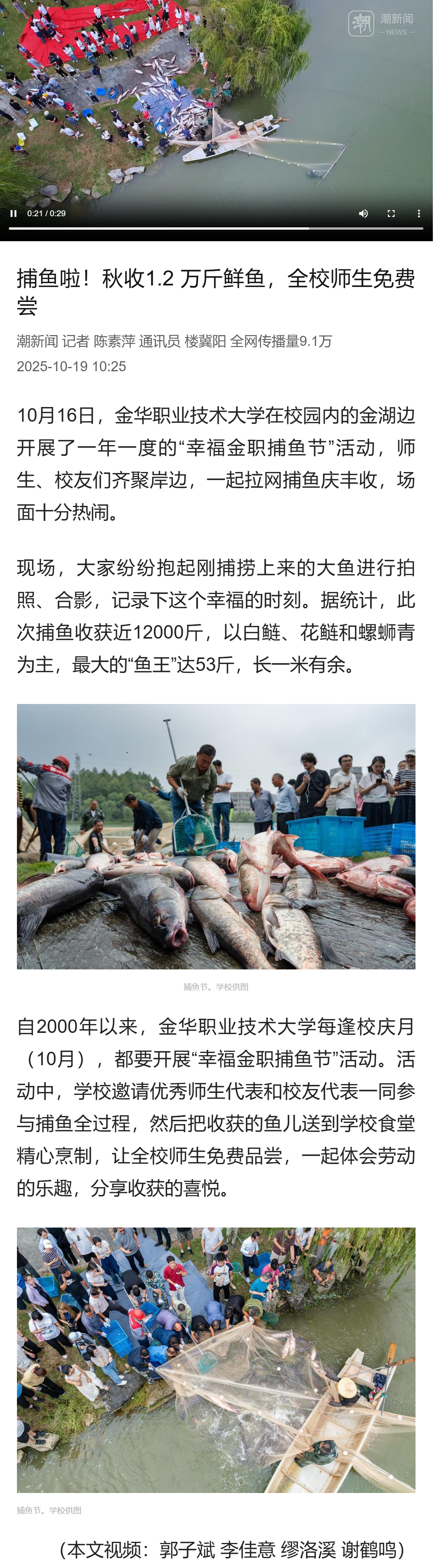 潮新闻客户端:捕鱼啦!秋收1.2 万斤鲜鱼,全校师生免费尝
