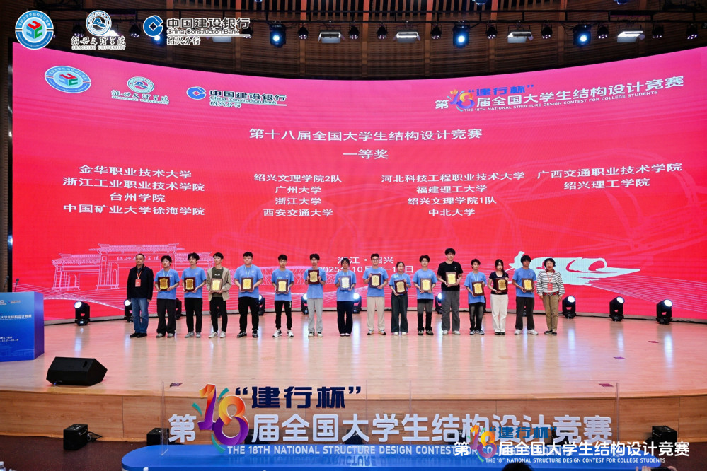 10月15日至20日,2025年“建行杯”第十八届全国大学生结构设计竞赛在绍兴文理学院举行,经过激烈角逐,由建筑工程学院赵孝平、钱康、蒙媛三位教师指导,沈霖、吴旻轩、陈新月三位同学组成的代表队从1792支本专科高校参赛队伍中脱颖而出,获得全国排名第二的优异成绩,囊括了大赛一等奖和最佳创意奖,学校也获评优秀组织奖。这是学校连续第二年获得该赛事的全国一等奖。