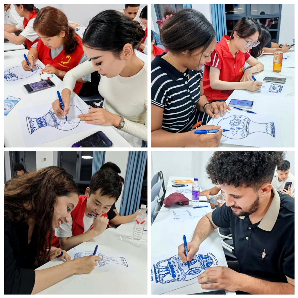 两个多小时的活动里,没有枯燥的理论讲解,只有“听、看、做、悟”的深度互动。一位留学生在体验后感慨:“以前读‘白釉青花一火成’只觉得是句诗,今天亲手画了青花,才懂这句诗里蕴含的工艺与审美。”活动结束后,同学们纷纷展示自己的独特作品。这场活动不仅是一次汉语言帮扶,更是一次文化审美的启蒙,让传统不再是书本里的文字,而是可听、可触、可创造的生活美学。