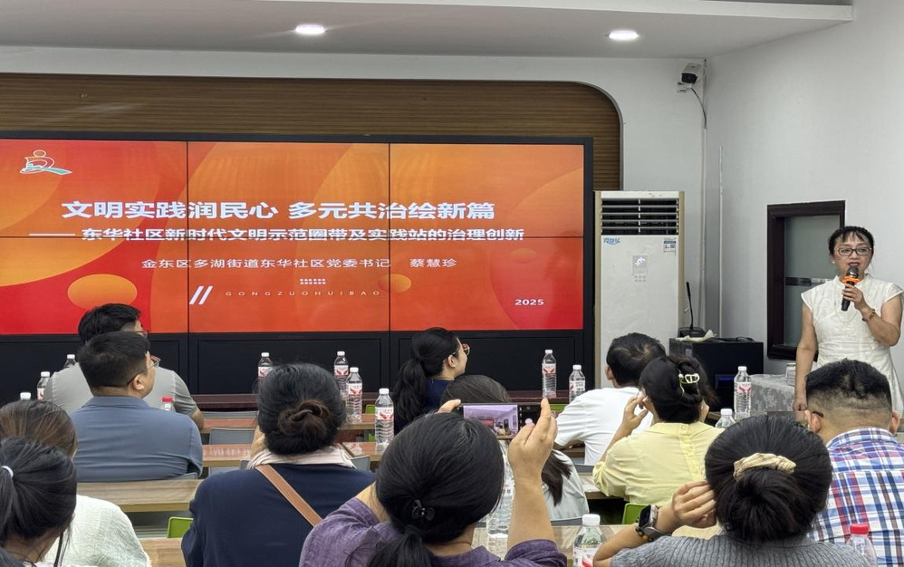 培训采用专题授课和现场教学相结合的模式,聚焦新时代文明实践建设的理论内核、标准解读、实务技巧、队伍建设等关键主题展开系统讲授,兼顾理论深度与实践指导性。现场教学环节中,学员们先后深入婺城区城东街道新时代文明实践所等10余个先进实践站点与示范圈(带),实地观摩阵地建设与运营实效,学习先进经验与创新做法。分组研讨及成果汇报环节中,各小组围绕实际工作中存在的治理难题和现实困境展开热烈讨论,提出了一系列具有建设性的对策建议。