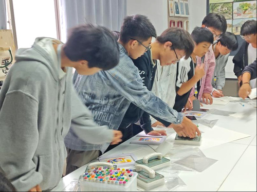 师生们还走访了公共艺术实训中心的陶艺与木工实训室,在亲手触摸材料、观摩创作的过程中,感受艺术实践的独特魅力。活动中,每位“3+2”班同学在“理想画室”美育工作室亲手制作了一套六色印章文创相纸,并写下了对未来的寄语与期许。一位同学表示:“这次研学让我对专业有了更具体的认识,回去之后学习目标也更加明确了。”