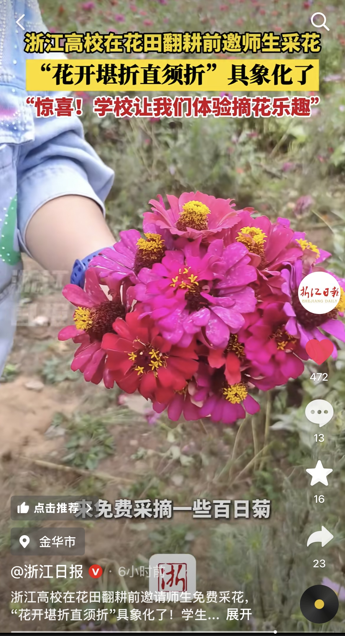 浙江日报抖音:浙江高校在花田翻耕前邀请师生免费采花,“花开堪折直须折”具象化了!学生:惊喜!学校居然让我们体验摘花的乐趣!(供稿:金华职业技术大学)