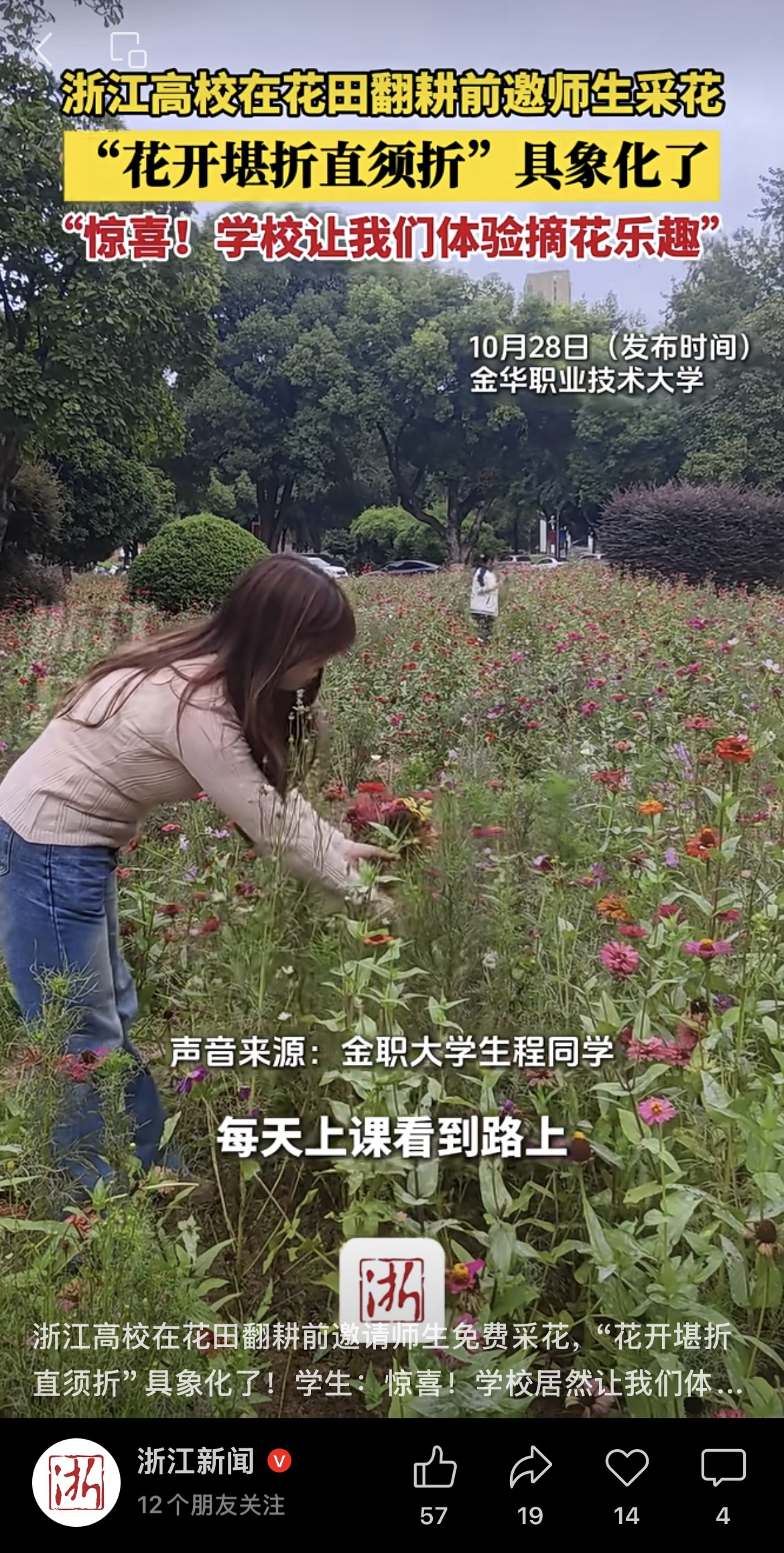 浙江新闻视频号:浙江高校在花田翻耕前邀请师生免费采花,“花开堪折直须折”具象化了!学生:惊喜!学校居然让我们体验摘花的乐趣!(供稿:金华职业技术大学)