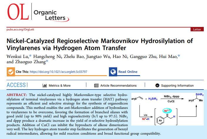 近日,制药工程学院鹿文魁博士以第一作者在国际有机化学权威期刊《Organic Letters》(中科院1区TOP)上发表高水平研究论文,题目为:Nickel-Catalyzed Regioselective Markovnikov Hydrosilylation of Vinylarenes via Hydrogen Atom Transfer。金华职业技术大学为第一通讯单位,制药工程学院教授毛辉、鹿文魁博士以及上海交通大学教授张兆国为共同通讯作者。