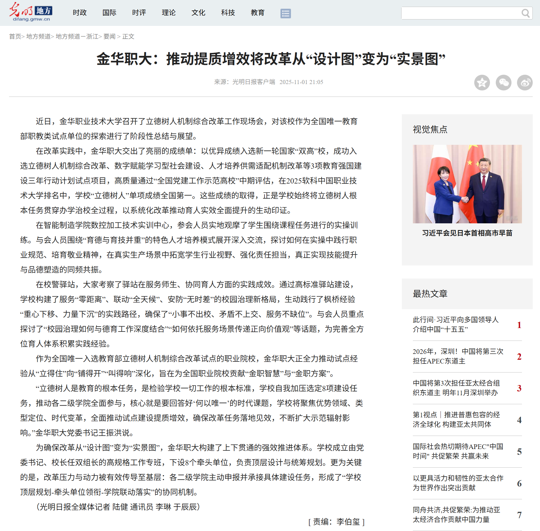 光明网:金华职大:推动提质增效将改革从“设计图”变为“实景图”