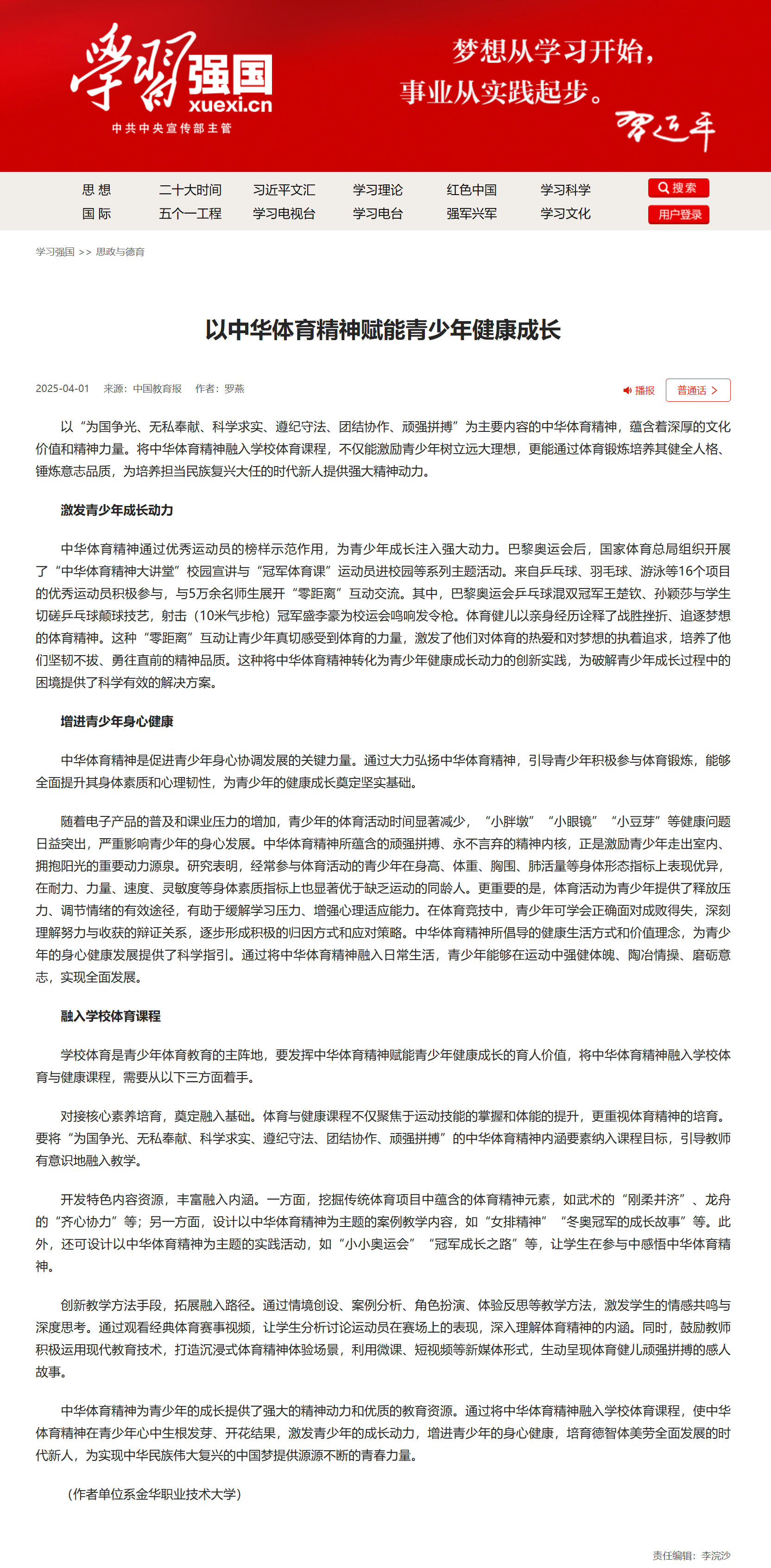 学习强国 中国教育报:以中华体育精神赋能青少年健康成长