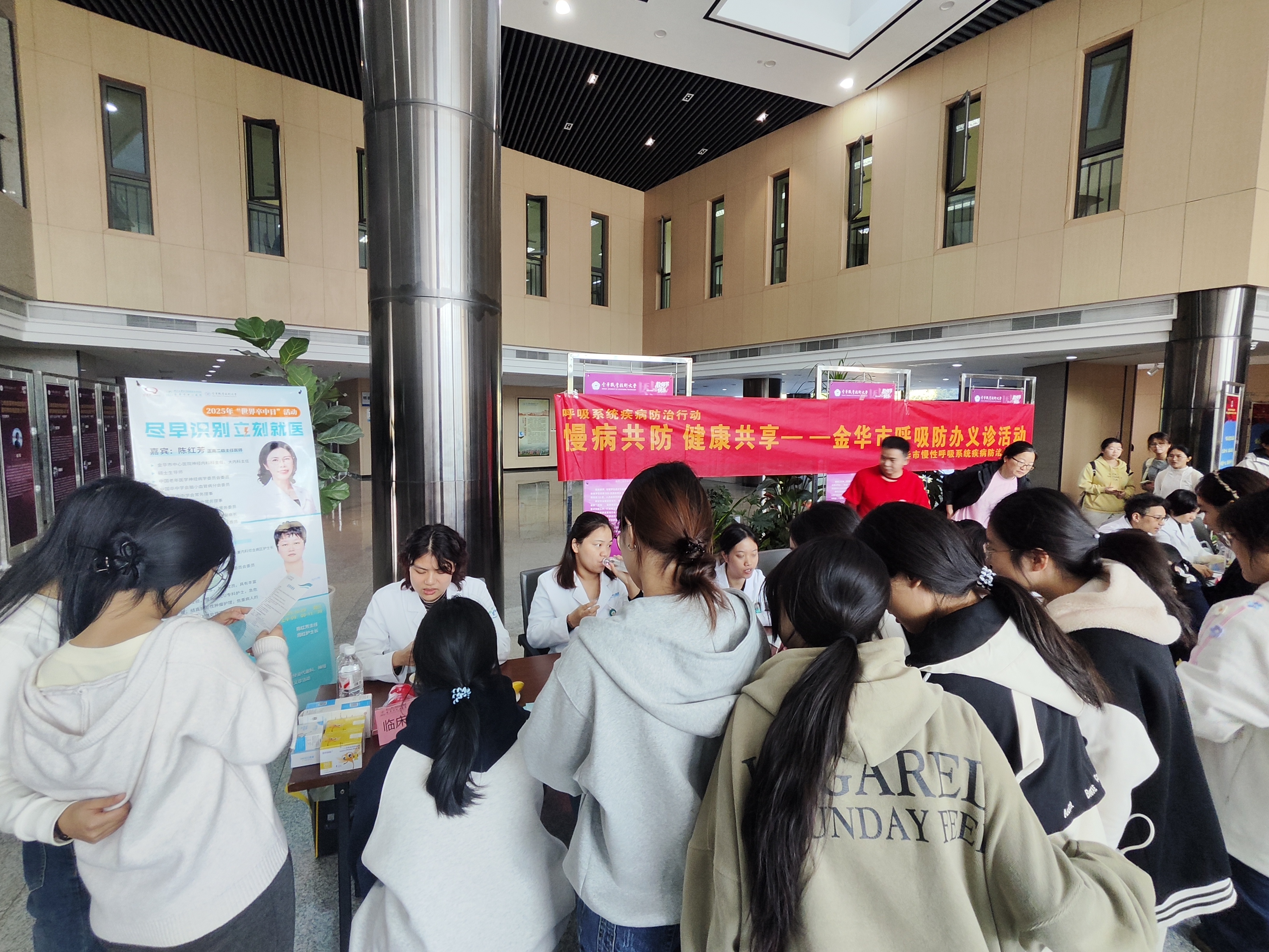 同一时间,会场外图信楼一楼大厅里,来自金华市中心医院的志愿者们和金华市中医医院的党员服务队队员们正耐心细致的为师生们答疑解惑、提供健康咨询服务,现场还设有中医药特色拔罐体验,受到师生们的一致好评。