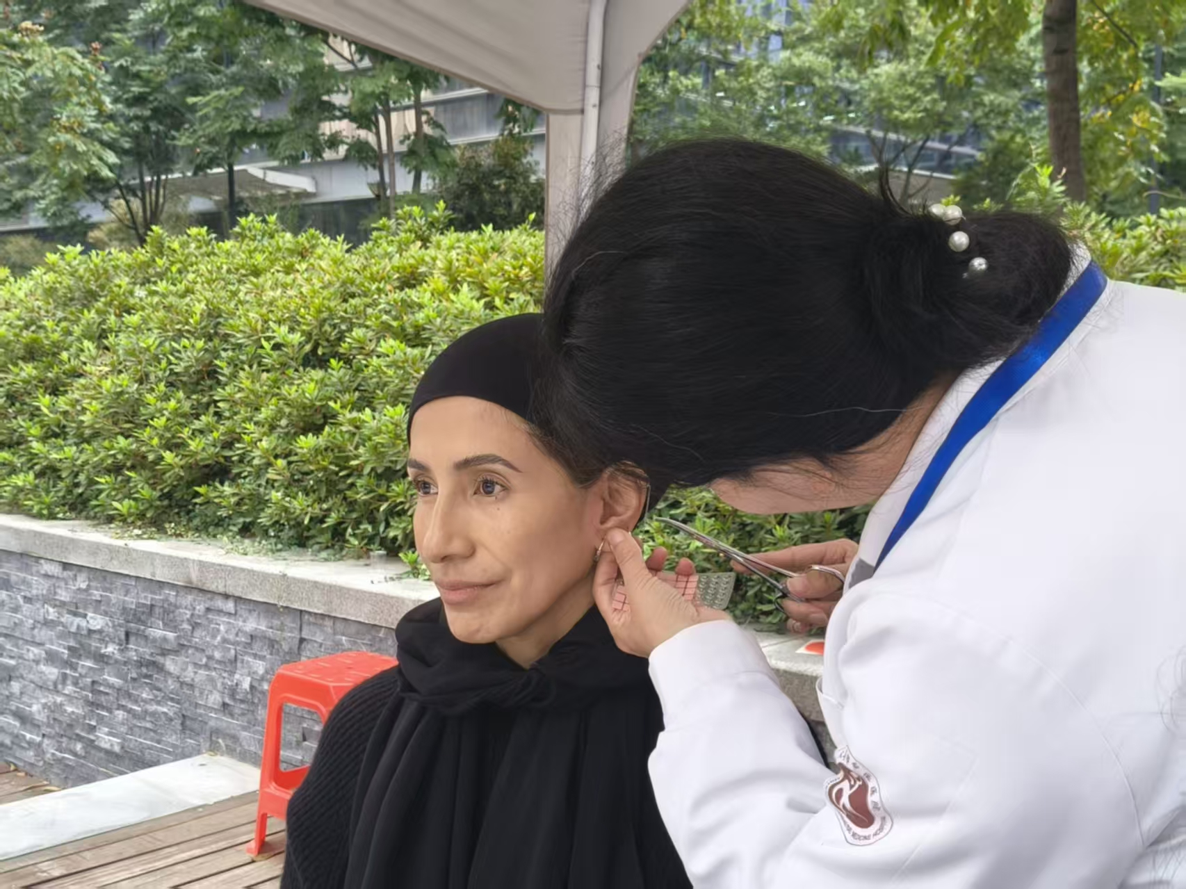 除了玛格丽特,现场还有很多在义乌经商、学习的外国友人参与其中。正在体验中医推拿的黑人小伙王一来自非洲,他提到:“中医推拿真是特别惊喜!大学的老师手法太专业了,推拿后肩颈的僵硬感马上缓解,整个人都舒服。”来自埃及的Monia女士表示:“耳穴压豆体验超棒!体验后疲劳感明显消退,非常愿意再次体验并推荐给身边人!”