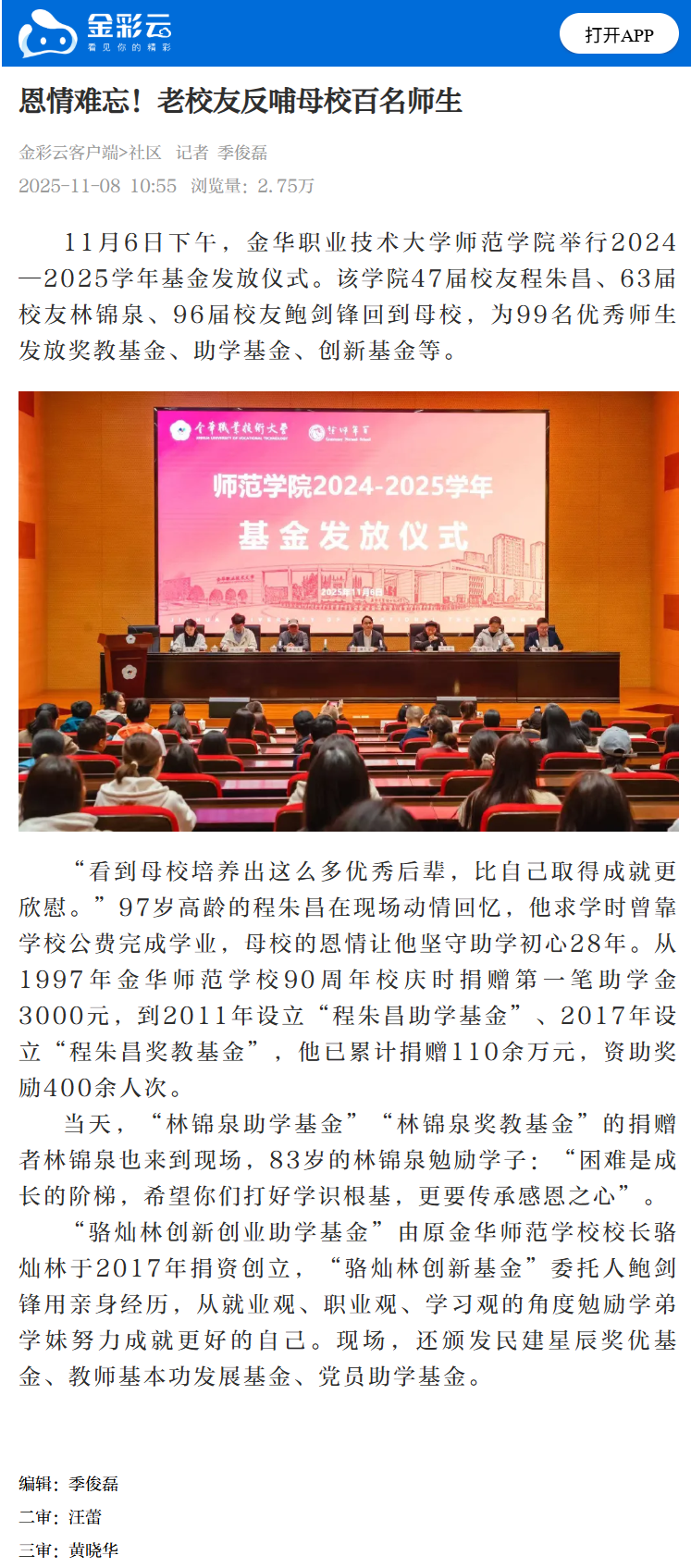 金彩云客户端:恩情难忘!老校友反哺母校百名师生