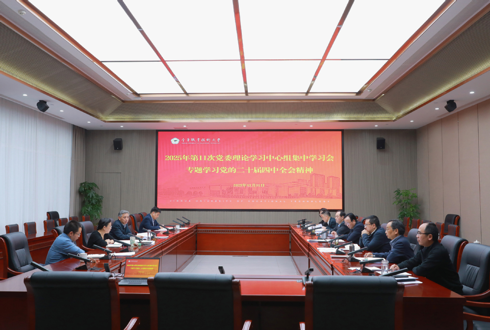 11月11日下午,金职大党委理论学习中心组召开2025年第11次学习会,专题学习党的二十届四中全会精神。校党委书记王振洪主持会议并作总结讲话。校领导班子成员参加会议。