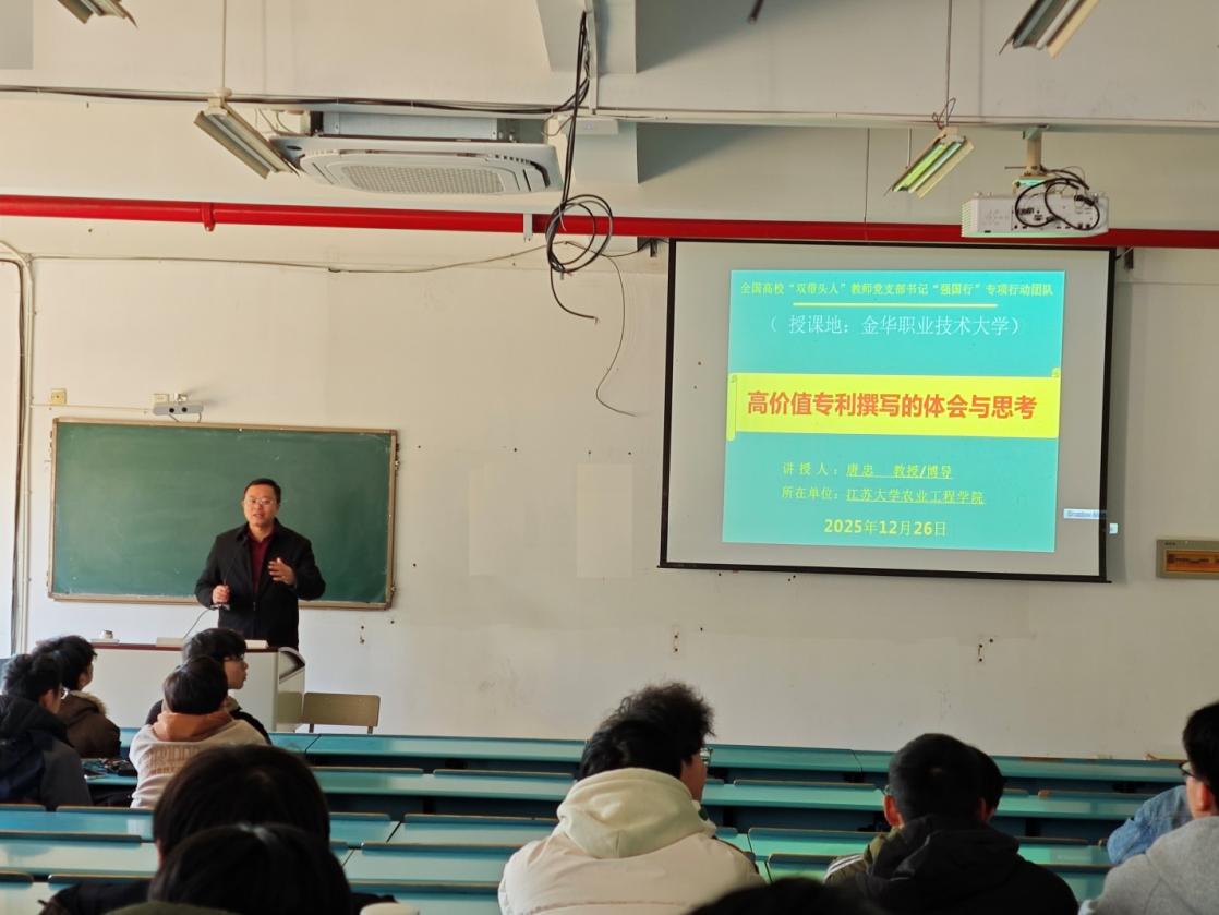 12月26日,金华职业技术大学智能制造学院举办“高价值专利撰写的体会与思考”专题讲座。本次讲座旨在深化产教融合、推动应用型人才培养,加强学生对高价值专利撰写与转化的理解与实践能力。讲座特邀全国高校“双带头人”教师党支部书记、“强国行”专项行动团队负责人、江苏大学农业工程学院唐忠教授担任主讲。学院工业机器人技术专业学生及浙江省农作物收获装备重点实验室科研助理参加培训。