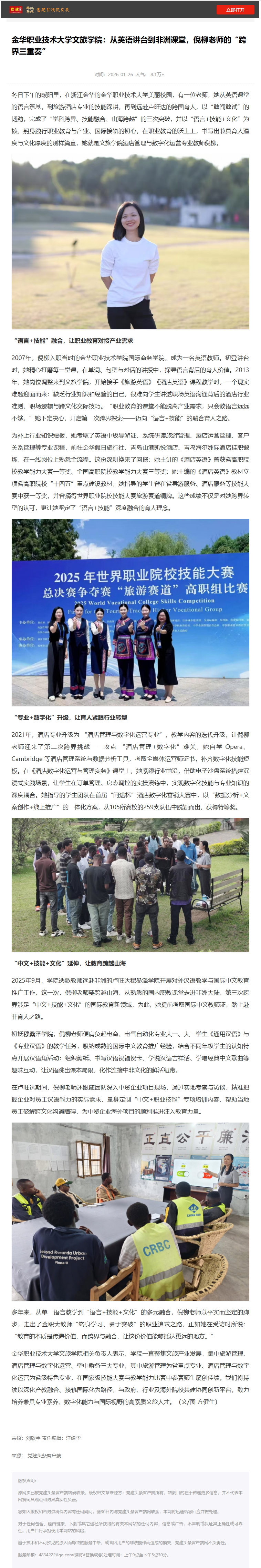 党建头条:金华职业技术大学文旅学院:从英语讲台到非洲课堂,倪柳老师的“跨界三重奏”
