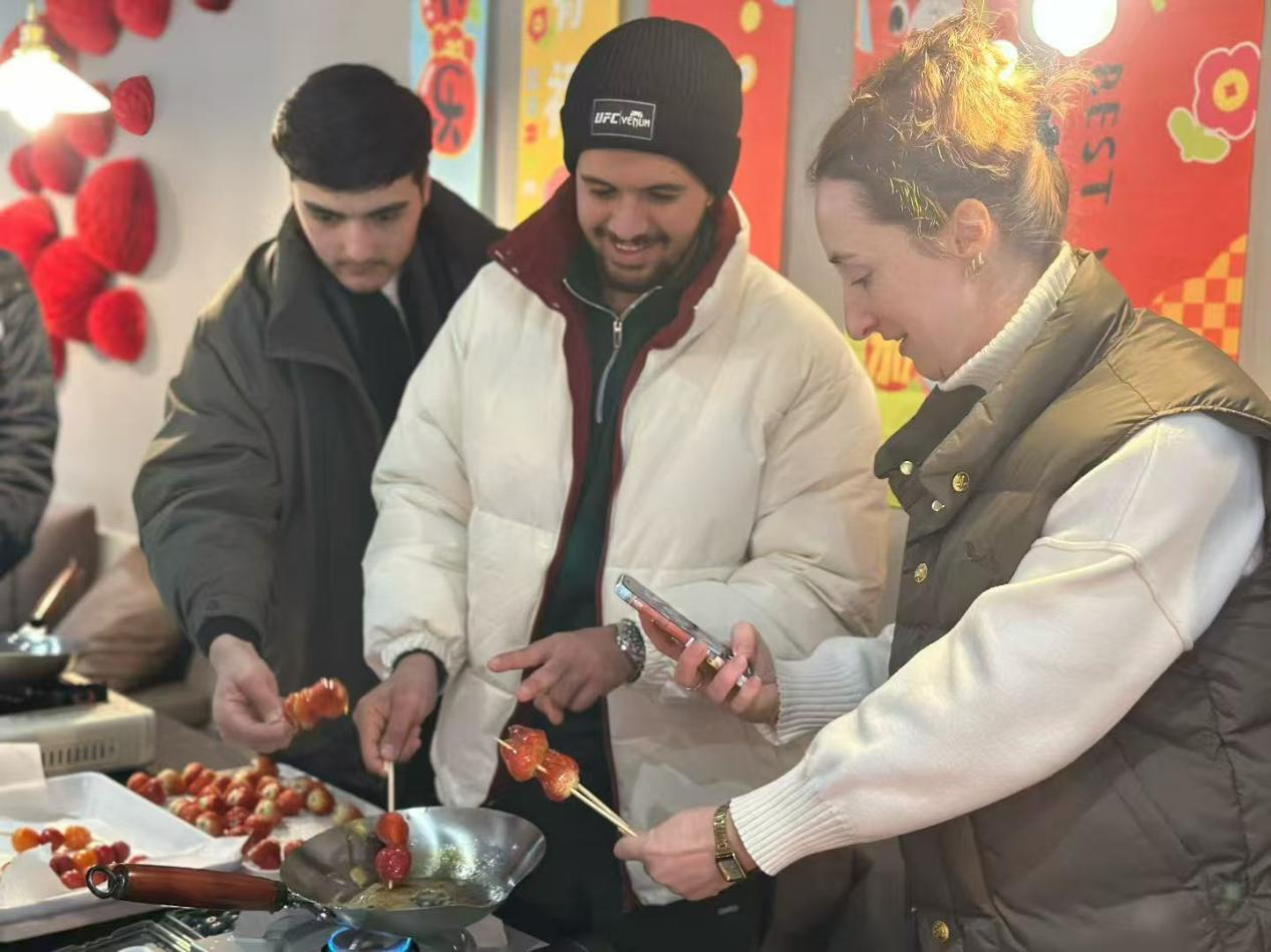 糖葫芦DIY、新春茶会、踢毽子、投壶等环节同样人气高涨。串起晶莹饱满的鲜果,裹上香甜酥脆的糖衣,外籍师生在亲手制作的过程中品味舌尖上的年味;围坐茶席共品香茗,在氤氲茶香里畅谈生活趣事;毽子腾空翻飞,投壶妙趣横生,此起彼伏的欢笑声将活动氛围推向高潮。大家在动手协作与亲切互动中,真切触摸到中国春节的民俗温度,感受到浓浓的喜庆韵律。