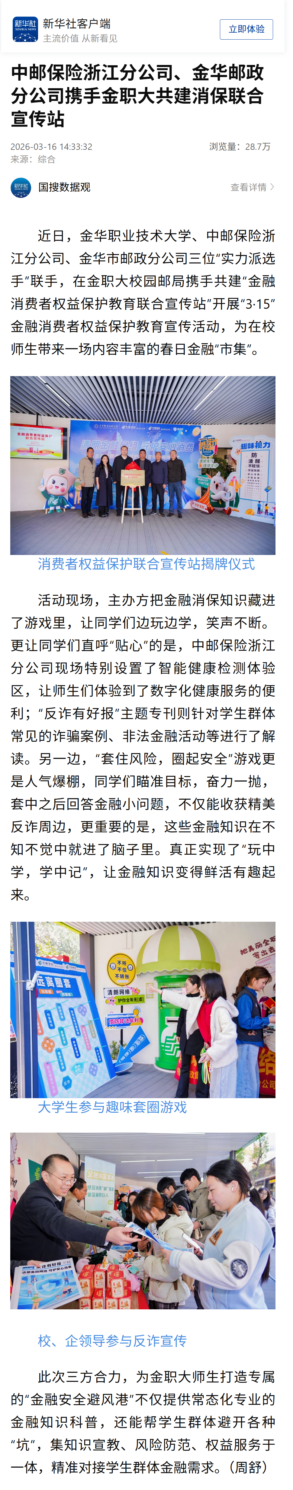 新华社客户端:中邮保险浙江分公司、金华邮政分公司携手金职大共建消保联合宣传站