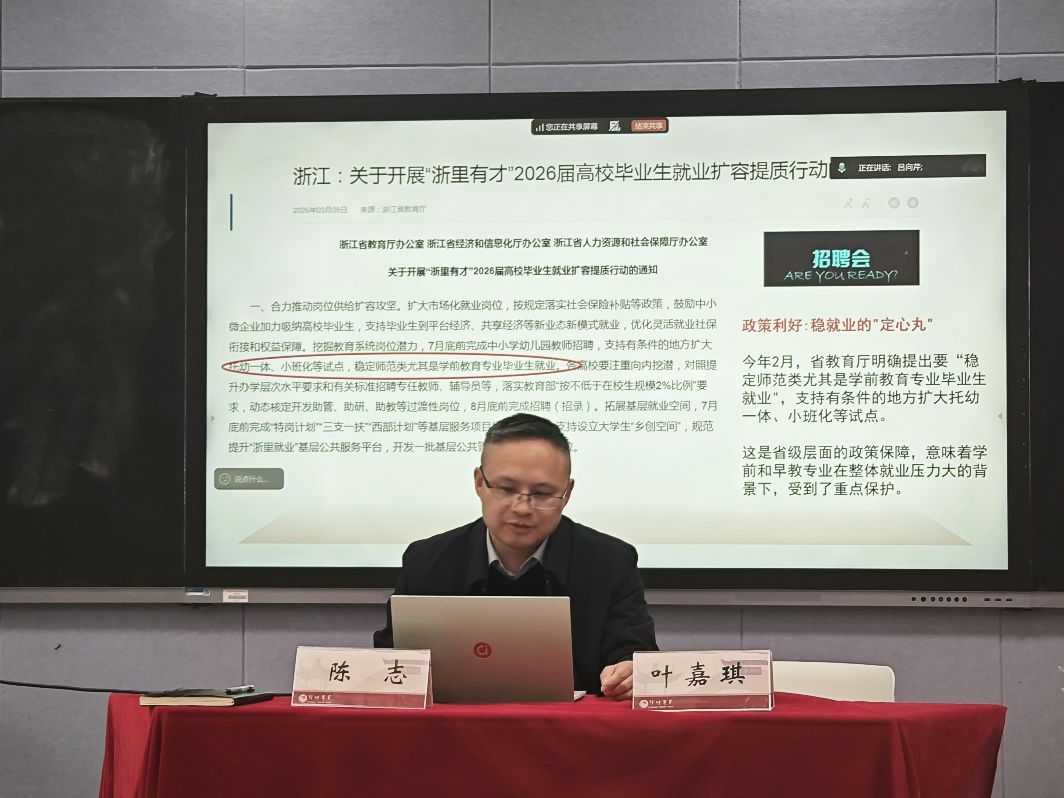 主讲人陈志就全国及浙江省的就业宏观背景,分析2026届毕业生面临的形势与机遇:2026届全国高校毕业生规模预计达1270万人,再创历史新高;浙江省高校毕业生突破46万人,留浙意愿持续增强;在国家经济运行稳中有进的背景下,稳就业重心正从“拓岗位”向“优匹配”转变。