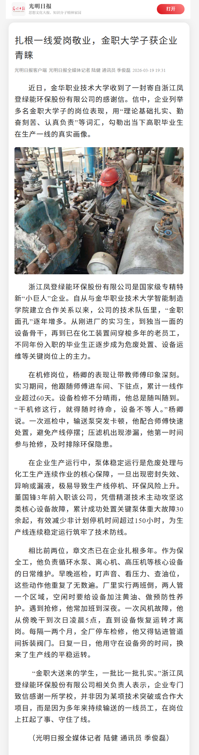 光明日报客户端:扎根一线爱岗敬业,金职大学子获企业青睐