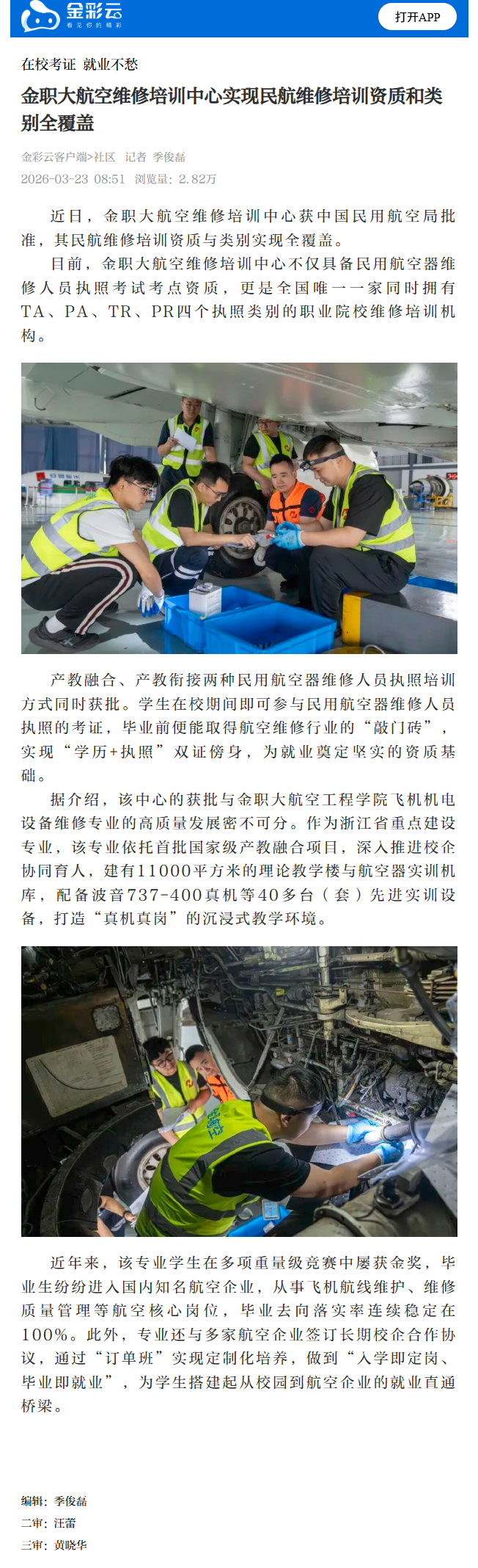 金彩云客户端:在校考证 就业不愁 金职大航空维修培训中心实现民航维修培训资质和类别全覆盖