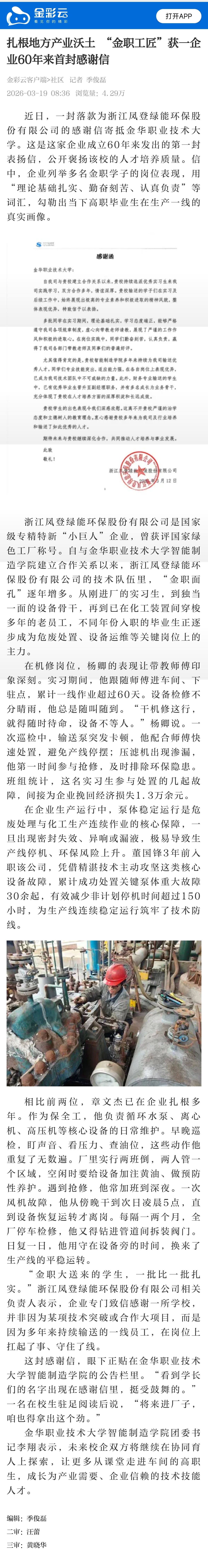 金彩云客户端:扎根地方产业沃土 “金职工匠”获一企业60年来首封感谢信