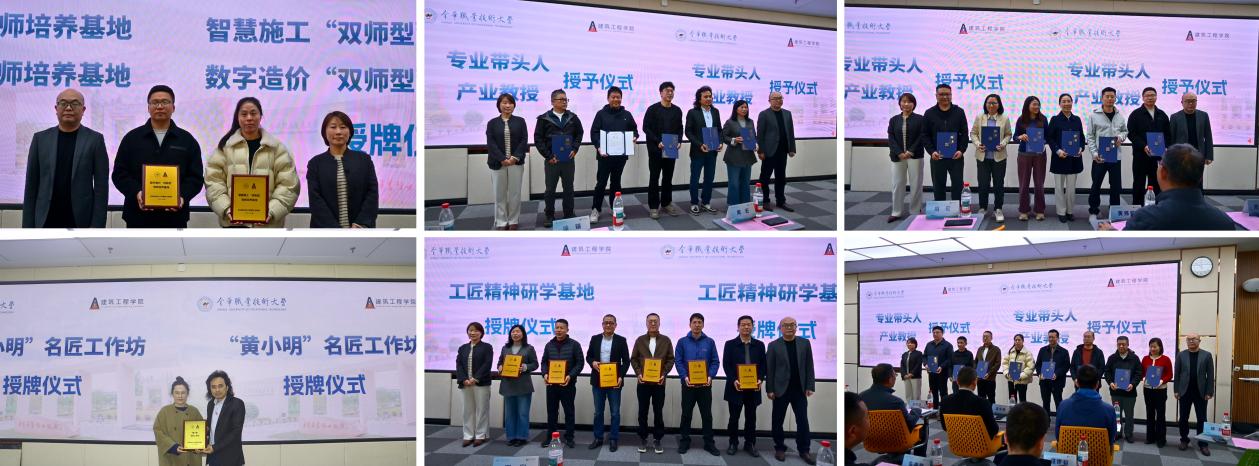 会议伊始,学院为新聘任专业带头人、产业教授颁发聘书,同步完成工匠精神研学基地、智慧建造产教融合实践中心、“黄小明”名匠工作坊、“双师型”教师培养基地等产学研平台的授牌仪式。系列平台的落地,不仅为学院“研产业、研岗位”引入了行业前沿资源、岗位标准与优质师资,更为“研数智化、研评价”搭建了实践载体与协同机制,构建起“名匠引领、校企协同、产教共生”的育人体系。随后,会议紧扣“四研”核心内涵,分专业开展专题深度研讨。