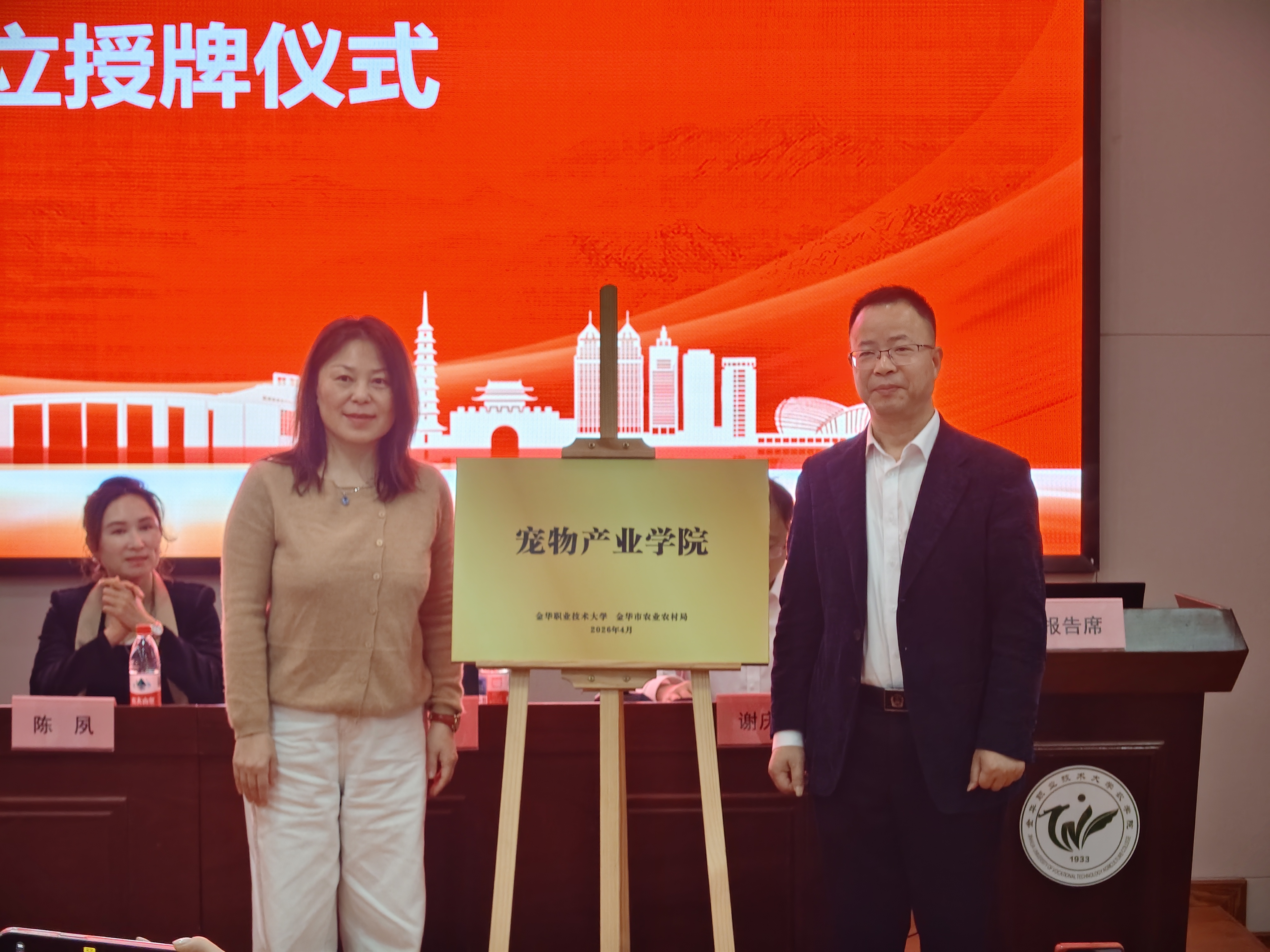 活动现场举行了金华职业技术大学与金华市农业农村局共建宠物产业学院成立及授牌仪式。宠物产业学院的成立,标志着学校在宠物产业领域“专业链对接产业链”迈出实质性一步,并将以此为载体,凝聚多方合力,打造集人才培养、技术创新、社会服务、就业创业、行业引领于一体的区域性宠物产业产教融合高端平台,更好为浙江乃至全国宠物产业输送“下得去、留得住、用得上”的高层次技术技能人才。