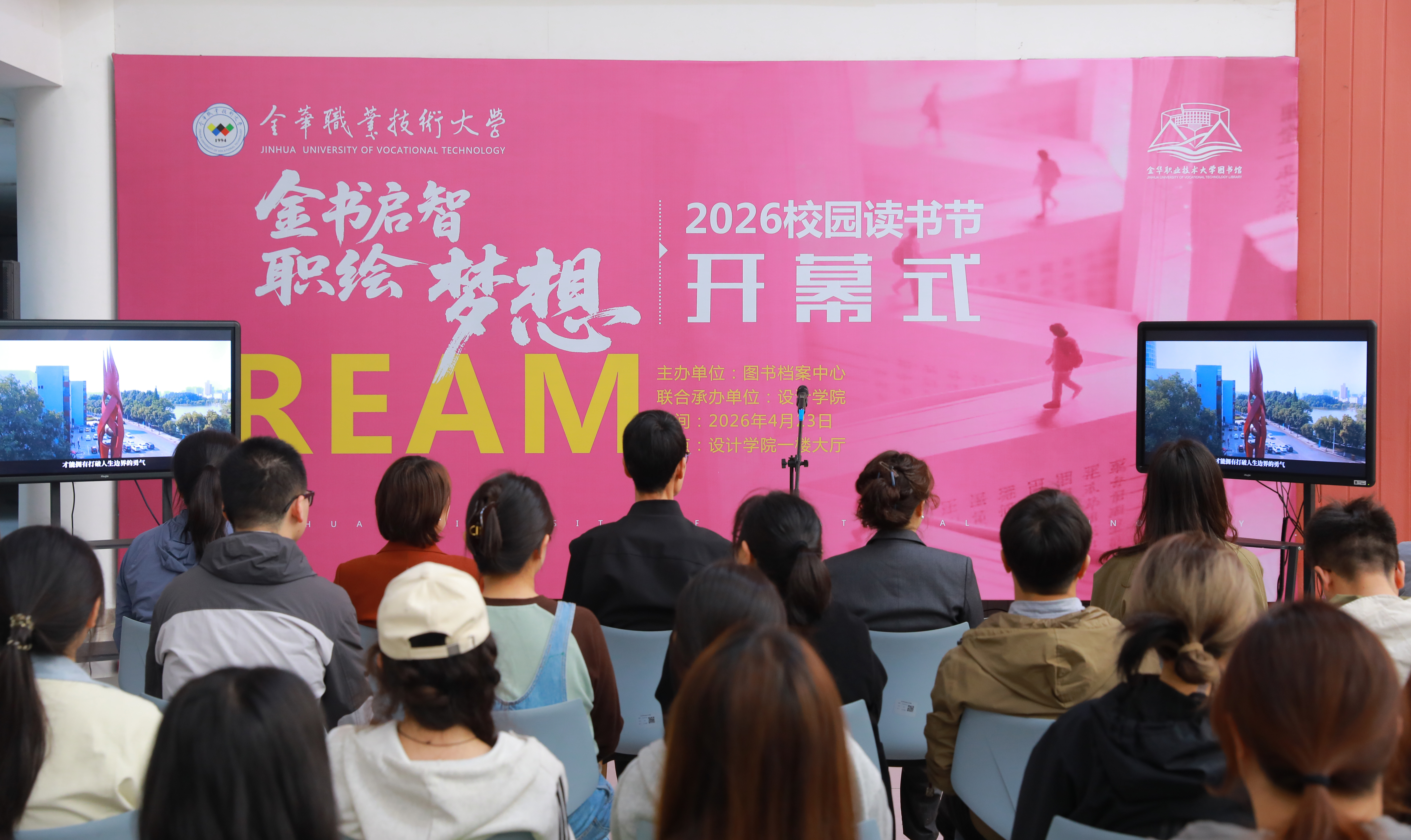 4月23日,正值第31个“世界读书日”,金华职业技术大学2026年“金书启智·职绘梦想”校园读书节开幕式在设计学院举行。本次活动由校图书档案中心主办、设计学院联合承办,副校长陈夙出席活动并致辞,各二级学院党委书记及师生代表共同参与。