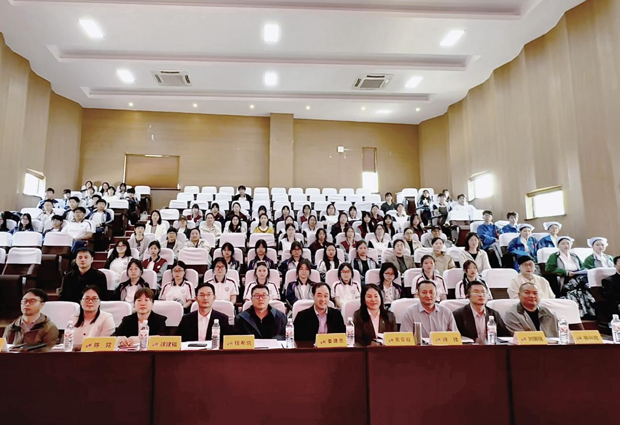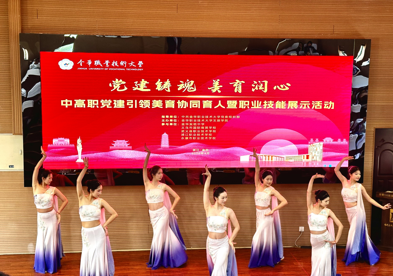 4月24日下午,由金华职业技术大学文旅学院主办,金华实验中学、义乌市国际商贸学校、永康市职业技术学校、浦江县职业技术学校、武义县职业技术学校共同参与的“党建铸魂·美育润心”中高职党建引领美育协同育人暨职业技能展示活动在学校举行。各院校党政负责人、师生代表齐聚一堂,通过技能作品展演、主旨演讲、分论坛研讨等形式,共同探索党建引领下美育与职业技能协同育人的新路径。学校纪委书记姜建忠,文旅学院相关负责人和五所中职学校的党政负责人出席仪式。