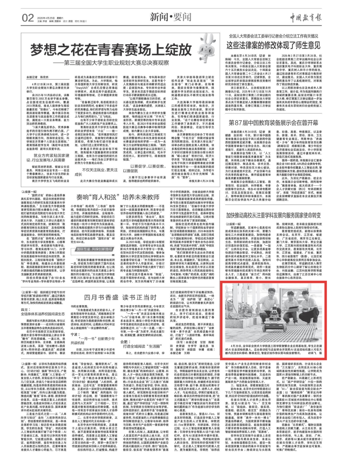 中国教育报:4月20日,金华职业技术大学信息工程学院智慧农业应用基地里,学生正在调试AI农业巡检机器人。这台由该校与企业联合开发的AI农业巡检机器人可在大棚内灵活全向移动、精准定位,智能识别作物长势与病虫害情况。