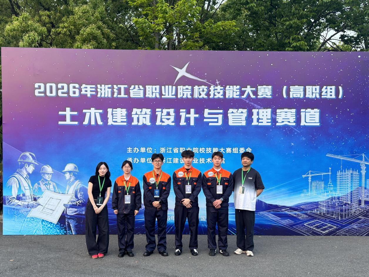 4月25至26日,2026年浙江省职业院校技能大赛高职组土木建筑设计与管理赛道在浙江建设职业技术学院圆满落幕,来自全省的68支队伍同台竞技。由建筑工程学院李思、张弦波两位教师指导,刘书睿、李子颖、吴秀统、胡津豪四位同学组成的团队经过激烈比拼,发挥出色,最终荣获该赛道金奖。