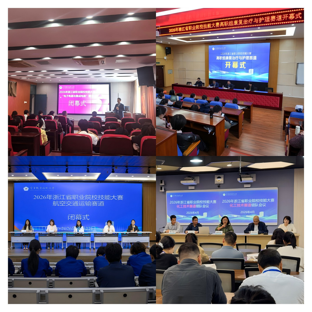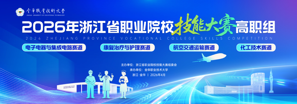 4月24日至26日,2026年浙江省职业院校技能大赛高职组电子电器与集成电路赛道、康复治疗与护理赛道、航空交通运输赛道、化工技术赛道的比赛在金华职业技术大学顺利举办。本次大赛由浙江省职业院校技能大赛组委会主办,金华职业技术大学承办。来自全省39所高职院校的153支队伍、612名选手齐聚金职,以技会友、以赛砺能,充分展现了全省高职师生的专业素养与工匠精神,也彰显了学校的办学实力与服务职教发展的使命担当。