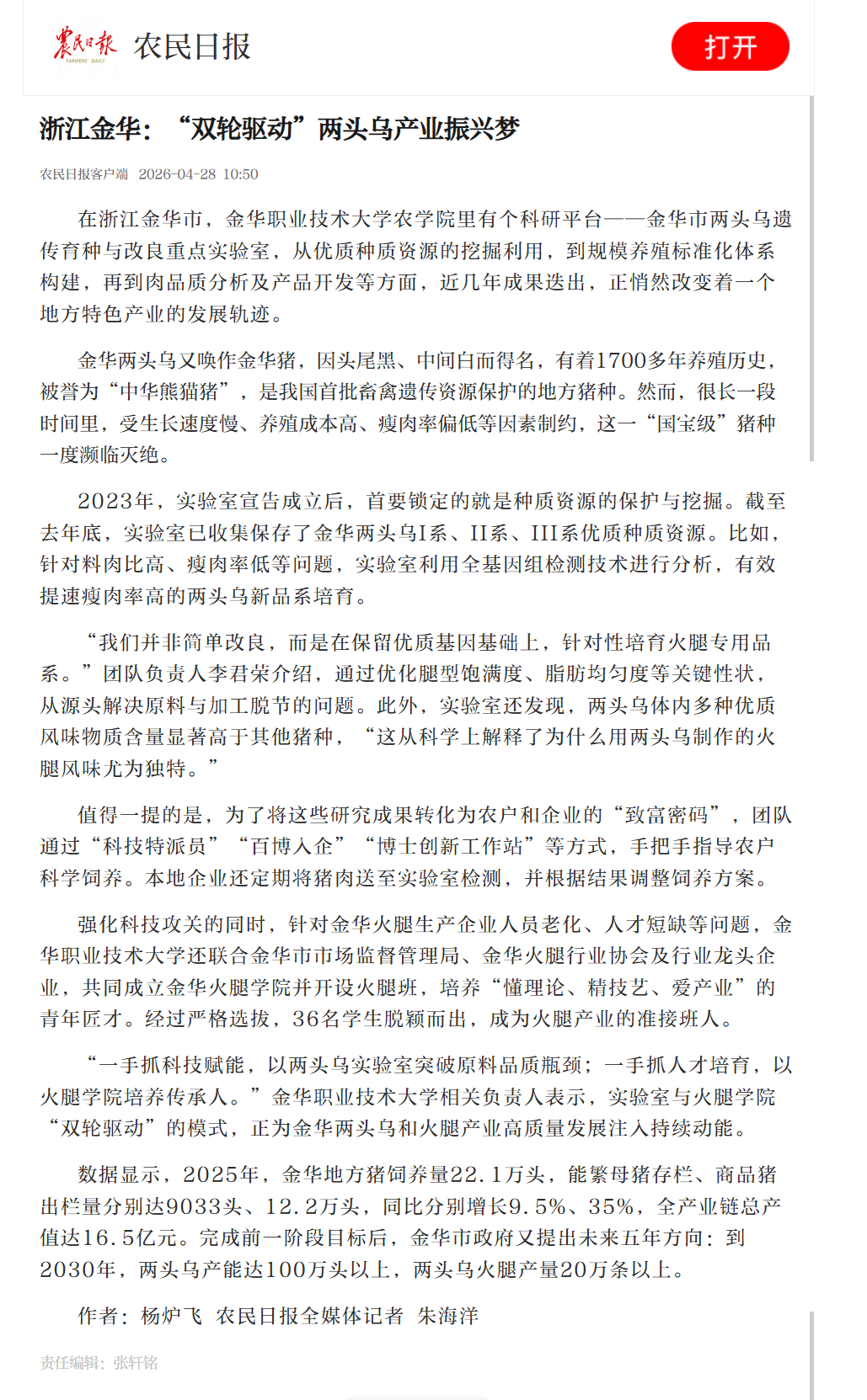 农民日报客户端:浙江金华:“双轮驱动”两头乌产业振兴梦
