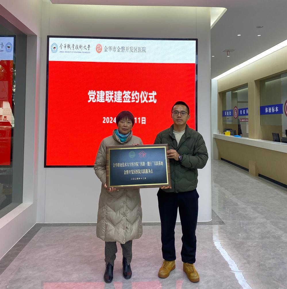 签约仪式前,双方挂牌成立金职大医学院“医路·健行”实践基地,设立金磬开发区医院实践服务点。