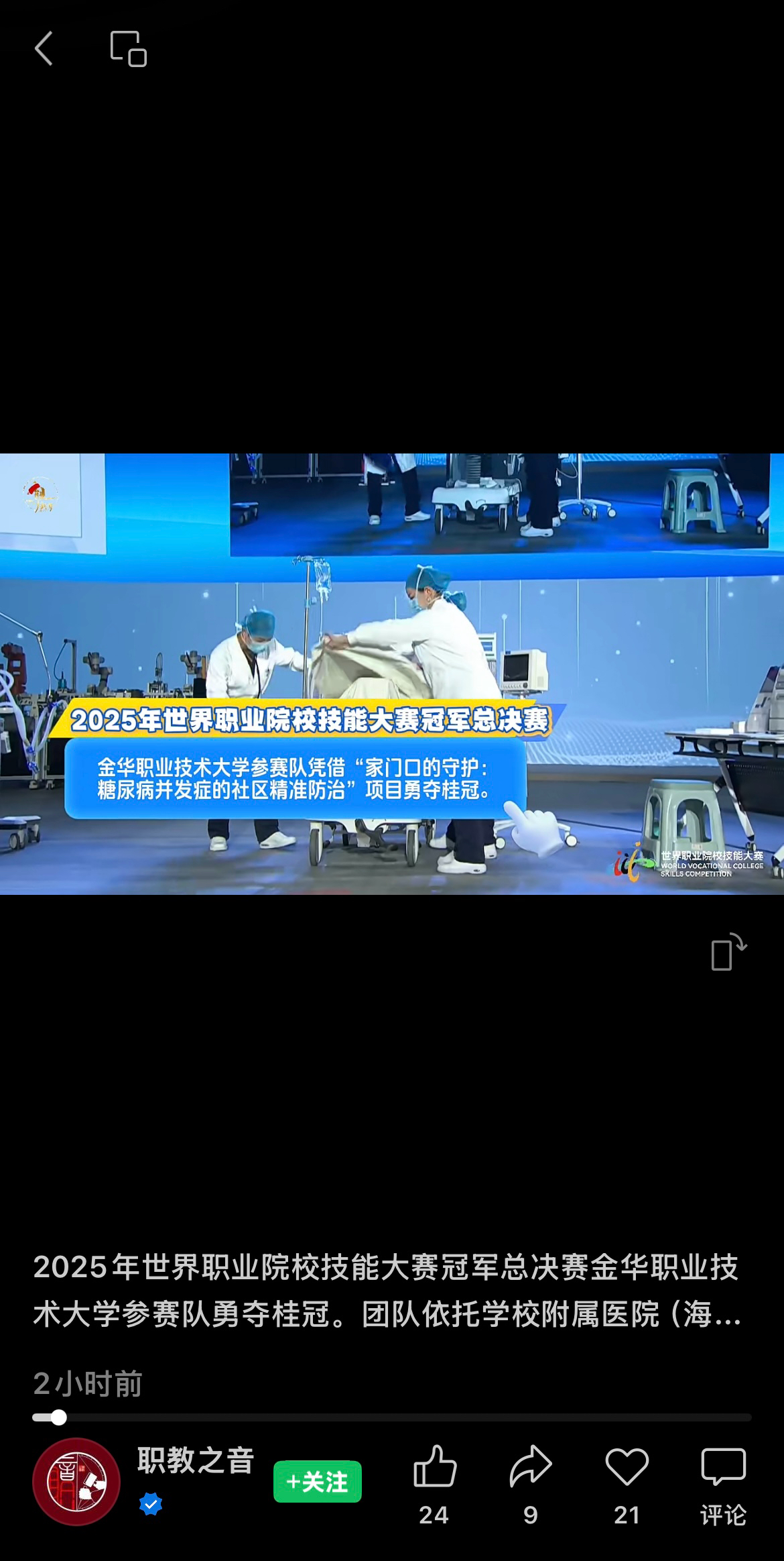 职教之音视频号:2025年世界职业院校技能大赛冠军总决赛金华职业技术大学参赛队勇夺桂冠。团队依托学校附属医院(海棠医院)的真实诊疗环境,开展全真模拟训练,让每一次操作都对接基层诊室的真实场景。