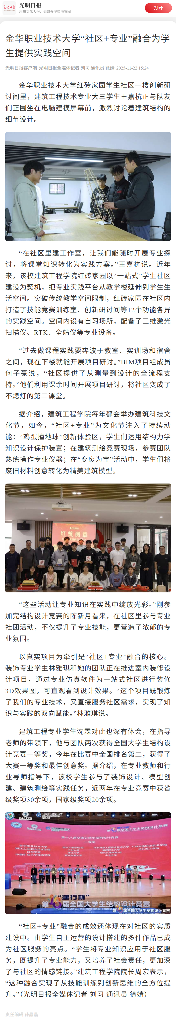 光明日报客户端:金华职业技术大学“社区+专业”融合为学生提供实践空间