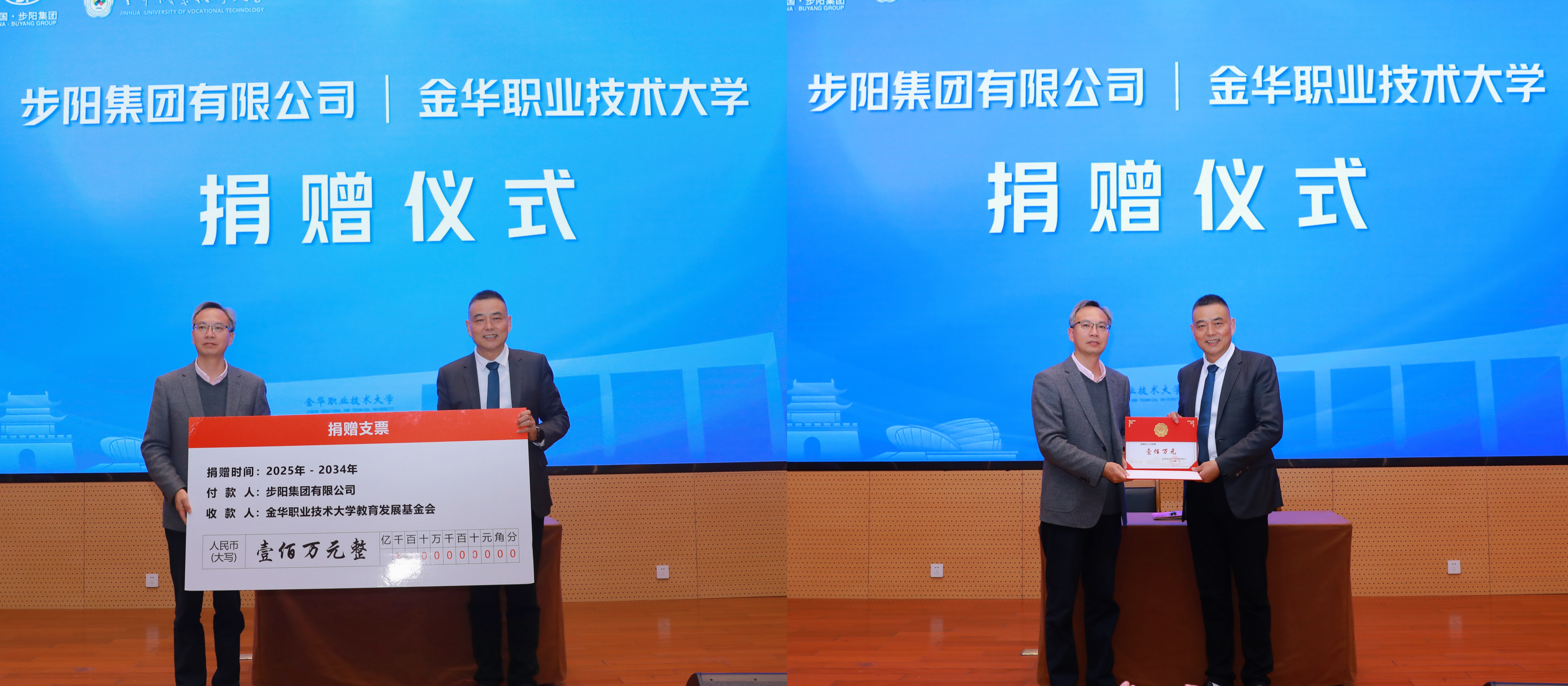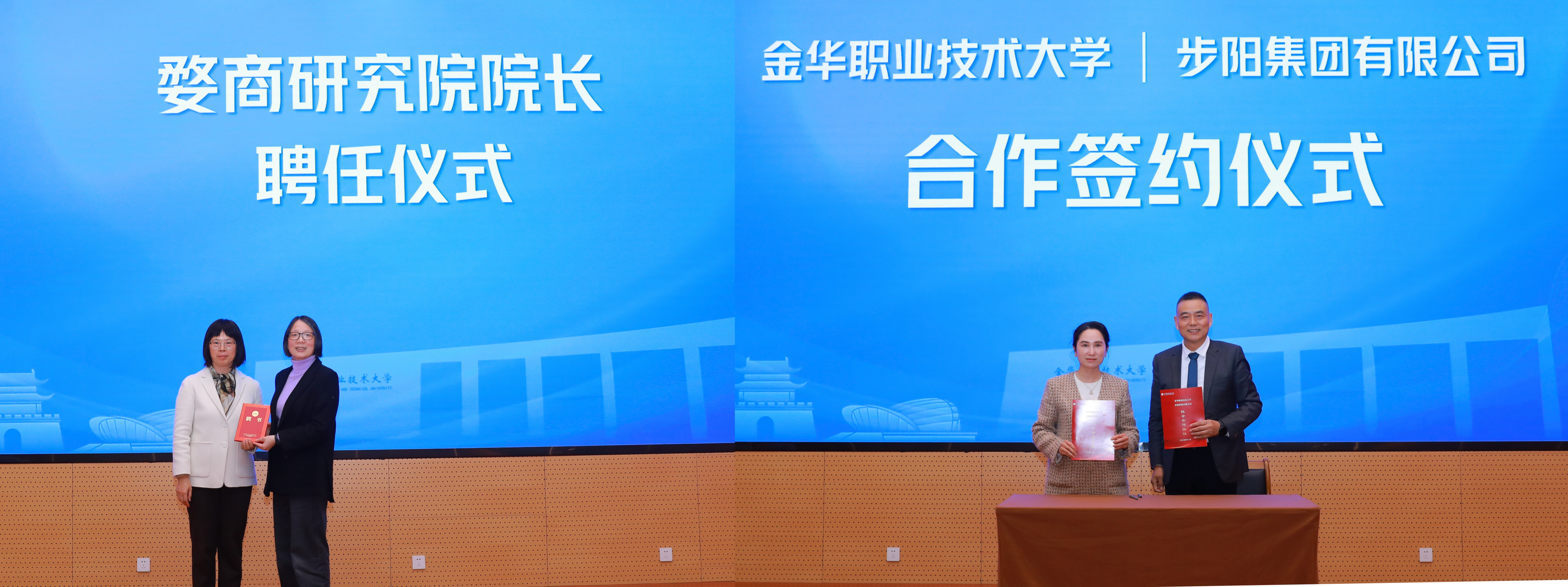 活动现场举行婺商研究院院长聘任仪式,商学院负责人受聘新职。金职大与步阳集团签署战略合作协议,步阳集团捐赠100万元支持学校教育事业发展。