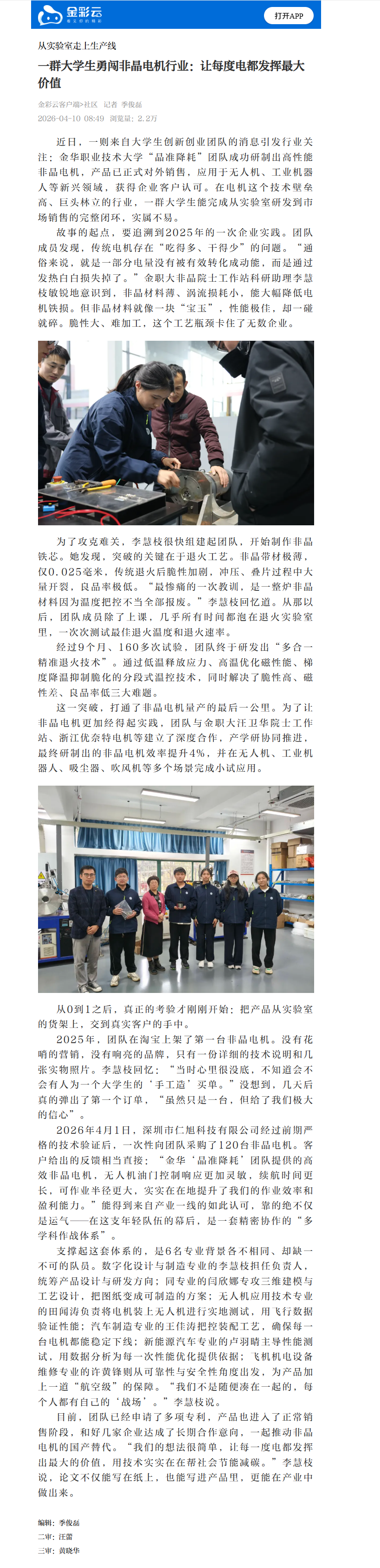 金彩云客户端:从实验室走上生产线 一群大学生勇闯非晶电机行业:让每度电都发挥最大价值